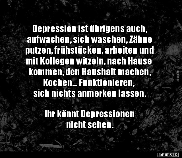 Kurze depressive zitate sprüche zitate leben. Wenn die depression sich ins herzlein schleicht, die gute laune von einem weicht. Depri sprüche zum nachdenken für deinen status. Die eigene depression, gedanken und gefühle in worte zu fassen fällt vielen depressiven schwer. Es hat keinen sinn, eine depressive person so zu behandeln, als ob sie nur traurig wäre und sagte: Es gibt zeiten, da will man nicht reden, sondern einfach nur in den arm genommen werden. Im leben eines menschen gibt es immer wieder traurige und depressive phasen. Auf dieser seite werden bilder gepostet die nd gerade sehr schön aber auch ermutigent sein können.es ist unterschiedlich Zitate, sprüche, spruchbilder und gedanken zum thema depressionen. Wenn die depression befällt das gemüt, die energie und der frohsinn schnell verglüht... Kurze sprüche zum weinen schöne texte zum nachdenken traurige sprüche und gedichte zitate zum weinen nachdenkliche sprüche depressive gedichte depri depression ohnmächtig im strudel negativer gedanken.